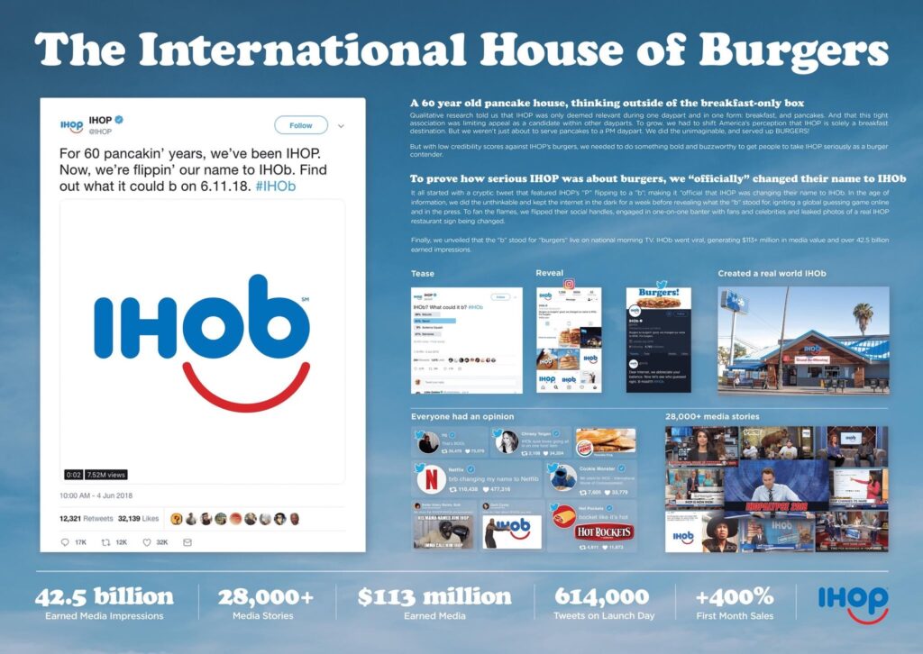 IHOP pretended to change its name to IHOb (International House of Burgers). People mocked it—but also tweeted, memed, and debated it. Result: burger sales quadrupled.